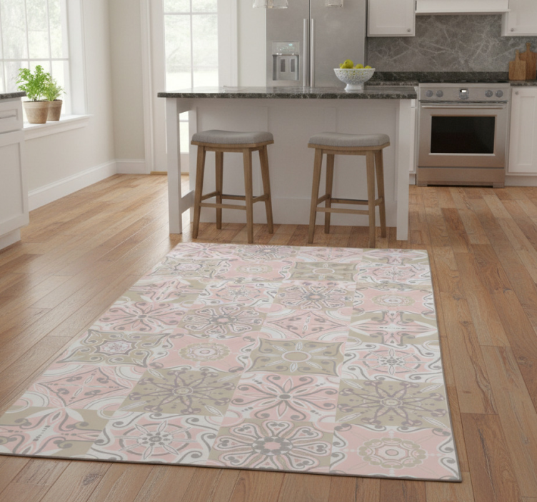 The Kitchen vinyl rug in pink and grey tile kitchen vinyl rug is a fantastic way to elevate your kitchen decor! Its vibrant colors and unique pattern can transform an ordinary space into a stylish haven. With its scratch-resistant and low-maintenance qualities, this rug not only enhances aesthetics but also offers practical benefits, making it a must-have for any homeowner looking to refresh their kitchen.
