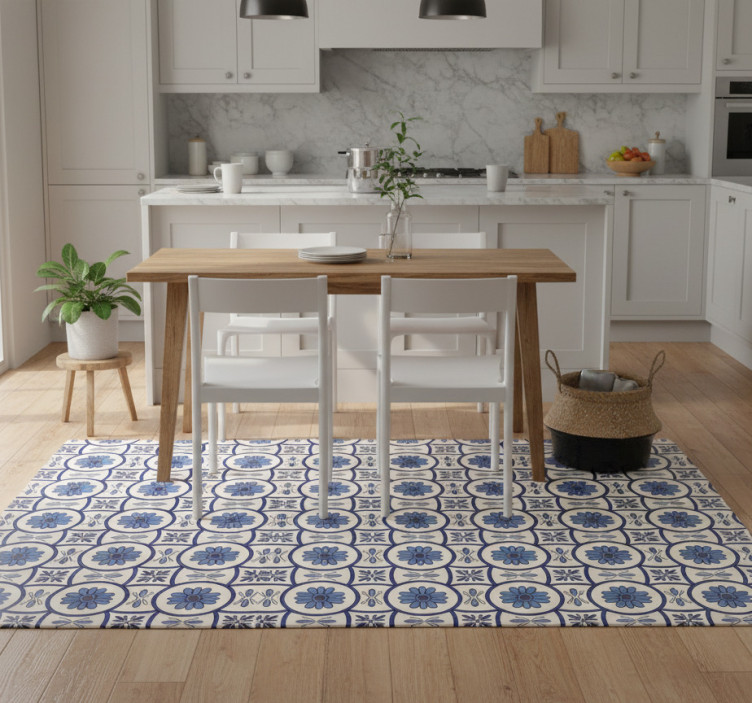 The Kitchen vinyl rug with blue flower portuguese tile kitchen vinyl rug serves as a perfect centerpiece in your kitchen decor. Its enchanting floral design radiates warmth and invites creativity, making meal preparations feel more enjoyable. This rug effortlessly complements various color palettes and styles, adding a unique touch that reflects your personality. Elevate your kitchen's ambiance with this delightful rug!