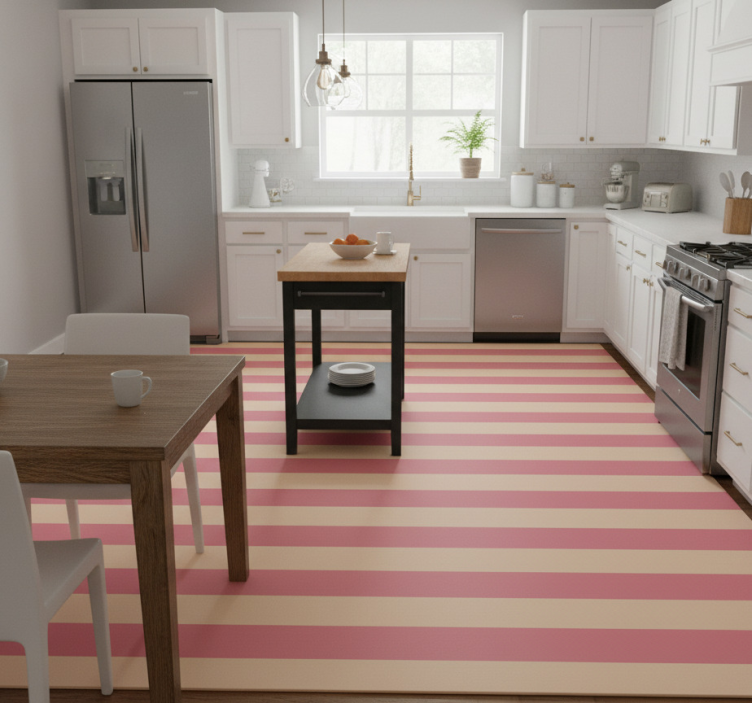 The Kitchen vinyl rug with pink horizontal stripes kitchen vinyl rug is perfect for adding a splash of color and personality to your kitchen. Its lively design effortlessly enhances the ambiance, making your cooking space more inviting and enjoyable. This rug not only serves as a decorative piece but also creates a cozy atmosphere that inspires culinary creativity!