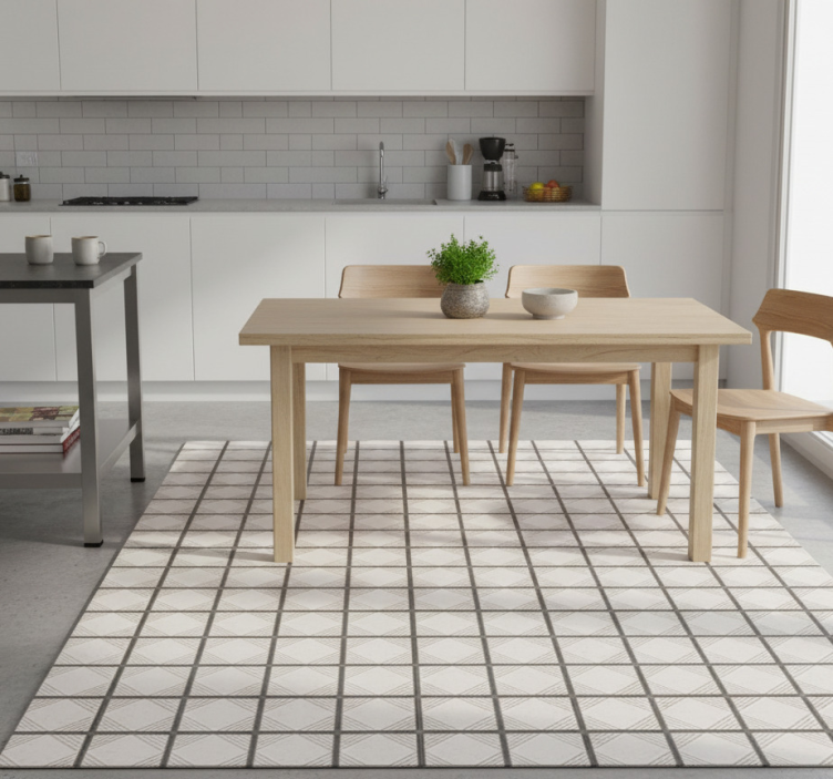 The Kitchen vinyl rug with white minimalist abstract tiles kitchen vinyl rug is not just a practical addition but a stylish statement piece. Its elegant design adds a touch of sophistication, elevating the overall ambiance of your kitchen. Imagine a chic, inviting area where you can gather with family and friends, all thanks to this beautiful rug!