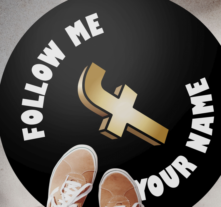 Are you looking for a smooth and classy way to attract new followers on Facebook? Look no further than our custom vinyl rug in bold black, featuring white and gold text that reads 'Follow Me' followed by your own name and a Facebook logo in the middle. With this unique and eye-catching rug, you'll effortlessly attract new followers and likes, helping you grow your business in no time.