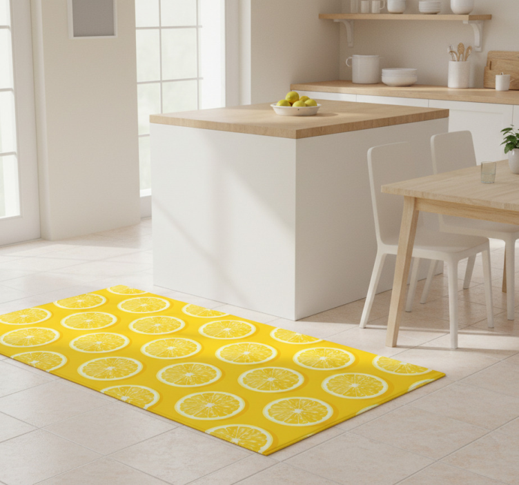 Reference: R23717Transform your kitchen into a vibrant culinary oasis with our Sliced lemons kitchen vinyl rug. This stunning design features beautifully illustrated lemons that burst with color, adding a refreshing and cheerful touch to your space. Perfect for anyone looking to brighten up their cooking area, this kitchen vinyl rug is not just functional but also a delightful visual treat!