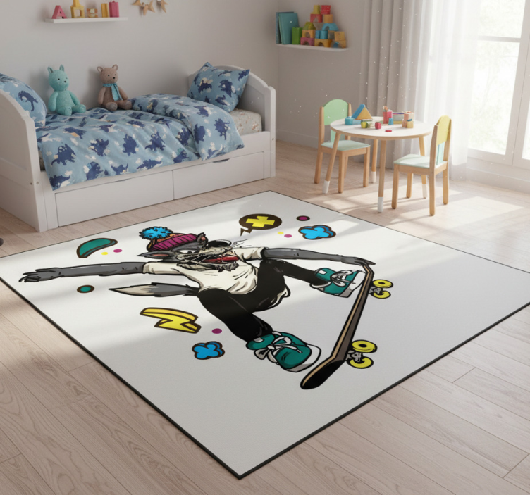 The Wolve on skate animal vinyl rug brings a playful yet stylish touch to your home decor, effortlessly enhancing any living area, playroom, or bedroom. Its creative design inspires joy and imagination, making it an ideal choice for both kids and adults alike. With its ability to complement various styles, this animal vinyl rug is more than just a floor covering; it's a statement piece that adds character and fun to your space!