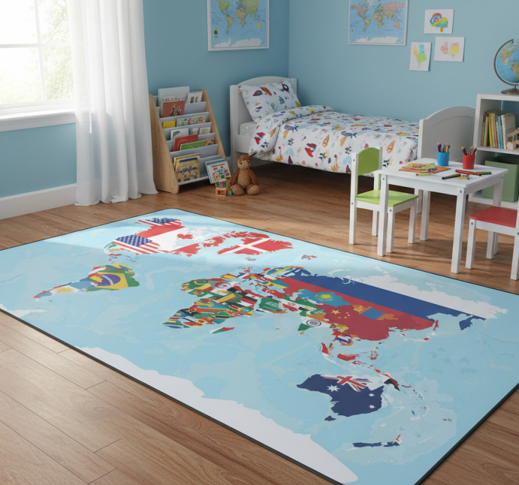World map vinyl rug with flag designs