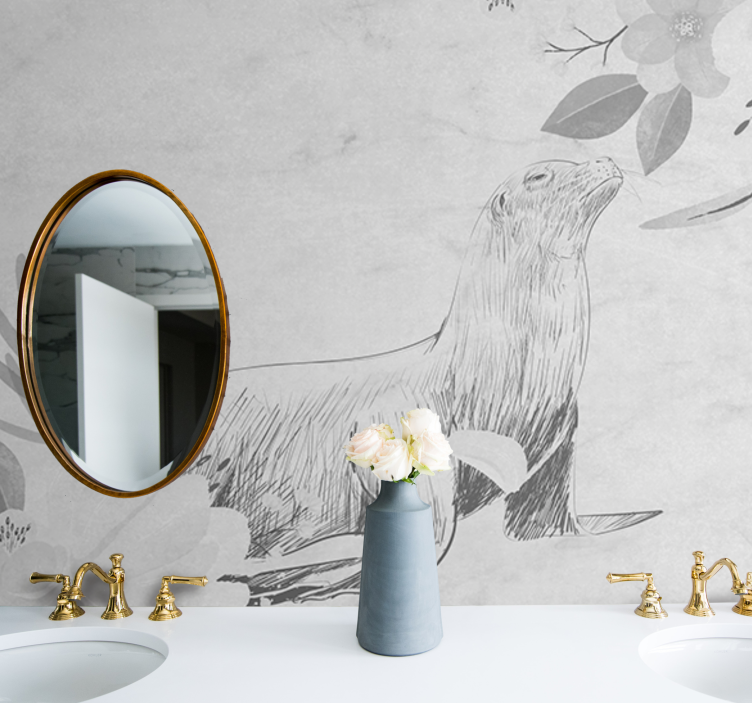 Transform your space with our stunning Bathroom mural seal surrounded by flowers. This beautiful design features a graceful seal surrounded by intricate floral sketches, creating a serene atmosphere that connects nature and artistry. The grayscale tones enhance the elegance of the animal and floral motifs, inviting a sense of tranquility into your bathroom.
