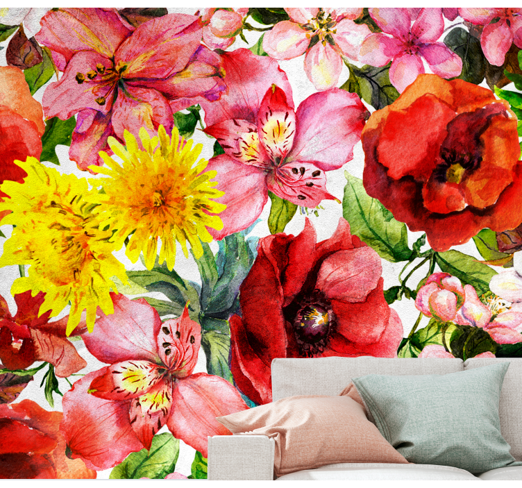 Immerse yourself in a breathtaking visual experience with our Flower mural vibrant bloom arrangement. This stunning design showcases an array of poppies, daisies, roses, and wildflowers in a delightful watercolor style, creating a flowery ambiance that breathes life into any space. The vibrant hues and intricate details of the flowers come together harmoniously, inviting a sense of joy and tranquility into your home!
