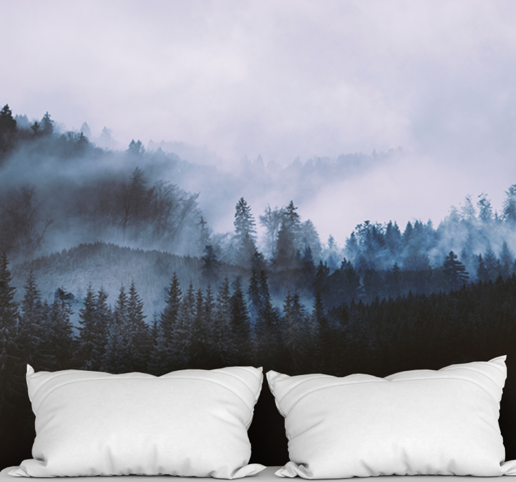Transform your space with the captivating Forest wall mural misty evergreen landscape. This stunning design features a harmonious blend of majestic trees, towering mountains, enveloping fog, and lush pines that create an enchanting evergreen landscape. The misty backdrop adds an air of mystery and tranquility, making it the perfect choice for any room seeking a touch of nature's beauty!