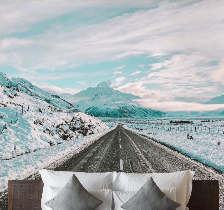 Transform your space with our stunning Landscape mural wallpaper icy mountain path. This exquisite design captures the essence of winter, featuring a breathtaking snowy road that winds through majestic mountains under a sky filled with soft clouds. The serene landscape invites you to escape into a world of tranquility and beauty, making it the perfect addition to your home decor!