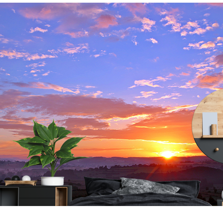 Transform your space with our stunning Landscape mural wallpaper sunset over hills. This captivating design features a breathtaking view of a sunset over rolling hills, where the sky dances with vibrant clouds and hues that evoke the beauty of nature. The majestic mountains form a serene horizon, creating a picturesque landscape that brings the tranquility of the outdoors into your home.