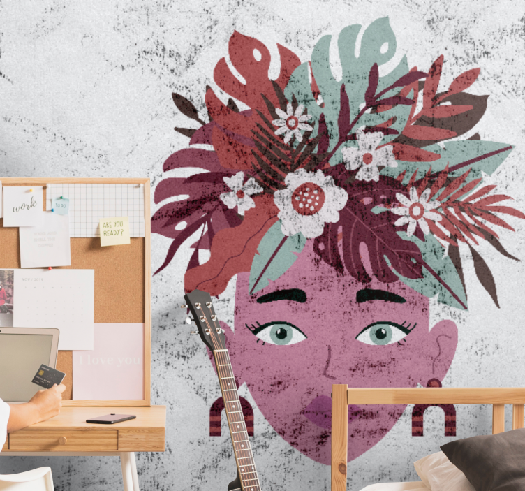 Introducing our stunning People painting mural stylized floral head, a captivating design that brings together the essence of femininity and nature. This remarkable piece showcases a woman's face adorned with vibrant flowers, tropical leaves, and intricate textures, creating a striking portrait that instantly enlivens any space!