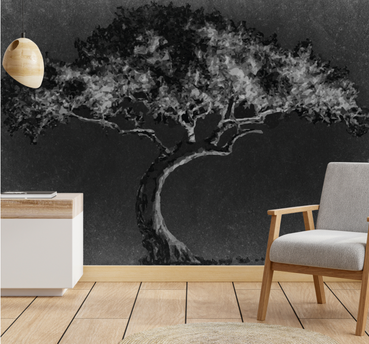 Introducing our stunning Tree mural graceful tree silhouette design, where the essence of nature meets artistic elegance. This beautiful mural features a serene bonsai tree silhouette against a peaceful night backdrop, rendered in striking black and white. It's a perfect representation of tranquility and beauty, ideal for transforming your space into a haven of calm.