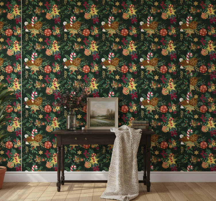 Reference: P12271Transform your hallway into a vibrant festive wonderland with our Hallway wallpaper festive candy design. This delightful wallpaper features a joyful arrangement of colorful candy motifs set against a soft matte background, creating a whimsical atmosphere that invites smiles and warmth. The non-woven material adds durability, ensuring that this charming design brings cheer to your space for years to come. With a grammage of 180 grams per square metre, it boasts impressive durability of 10-15 years, making it perfect for high-traffic areas.