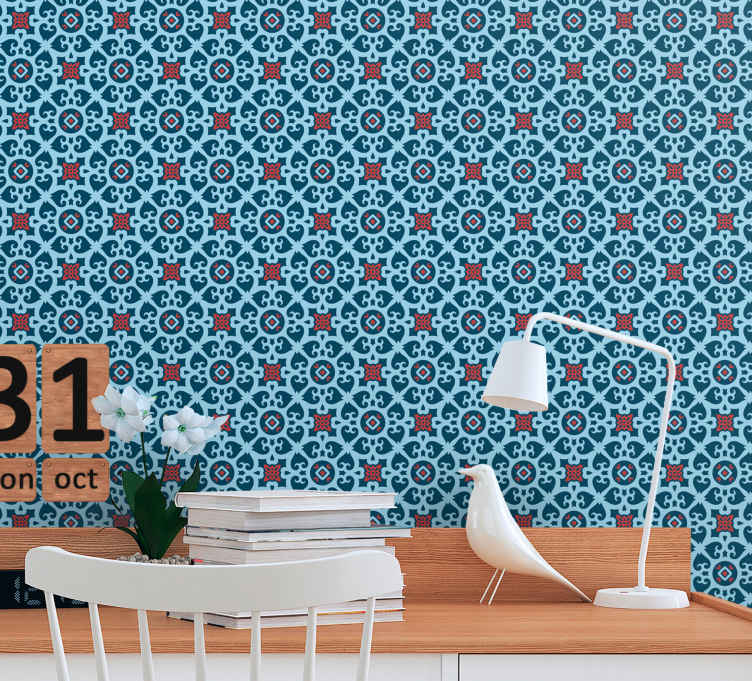 The Patterned Tiles tile wallpaper features a stunning graphic design that incorporates Indian, ornamental, and repetitive patterns. This decorative wallpaper showcases a gorgeous geometric pattern that adds a touch of elegance to any space. The matt colours and non-woven material make this wallpaper a durable and long-lasting option for decoration.